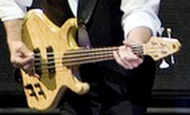 I saw John at the Mar 5th show in Chicago. Pretty sure it's a Turner. It actually has a reverse offset - in other words the treble side of the cutout is closer to the headstock than the bass side. He switched to what looked like a Tobias for one song, but played the Turner bass most of the night.