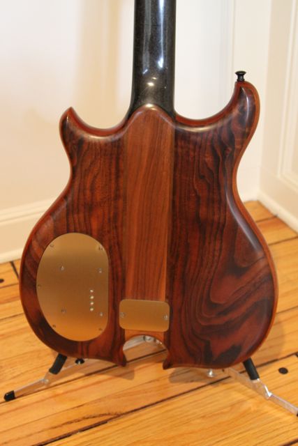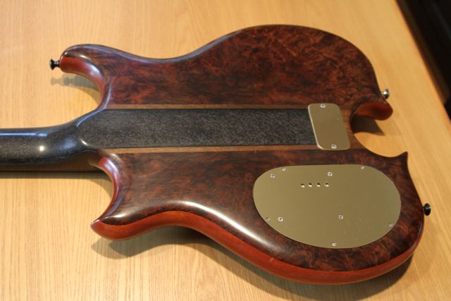 Some of the early instruments have a graphite plate as the back cover of the shape, so you see graphite weave on the back. A point body like mine is gigantic, so the graphite stops past the bridge but a couple of inches before the battery cavity. On a short scale like Mike's, the graphite may be all the way to the battery compartment if it's not relocated.