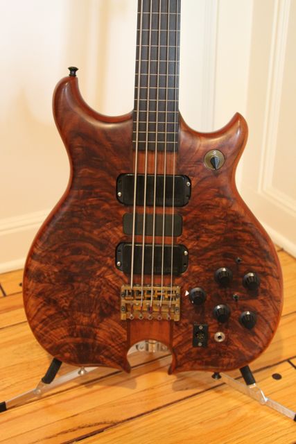 If you played this instrument, you would immediately notice that the neck is really narrow. There were different molds for 4-, 5-, and 8-string necks and in different scales. As was the style back in the late 70's or early 80's when the molds were made, then neck is really narrow and thick. Had I known this at the time, I would have had a 4-string built on the 5-string neck blank. The narrow width of the neck is why there are side laminates on the neck - I don't think most of the graphite Alembics have these.