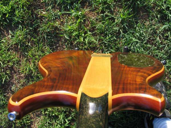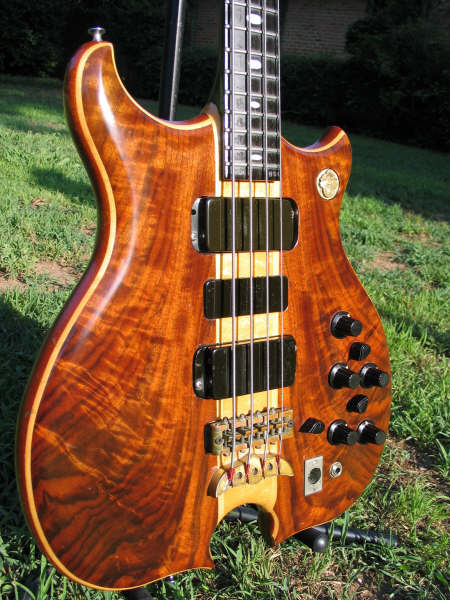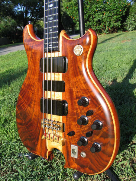 Walnut/maple/mahogany/maple/walnut would be my guess on the sandwich, and the bass is the one on Craigslist.