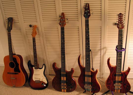 The family members are posed in order of seniority, left to right.  First is a Gibson B-45-12 (May 1966); second is a Fender Strat (September 1981); third is  (March 2005); fourth is a Rogue (February 2006); fifth is a Spectrum 12 (June 2007).  I think I'm done :-)!