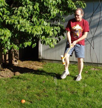 While the debate raged on, we BBQ'd some chicken, had cranberrie cole slaw, drank beer and played croquet. Me sizing up a shot: