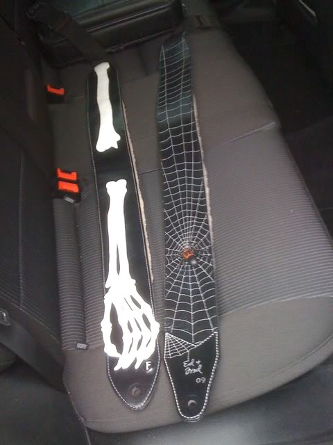 Graeme, I have two of those straps. They are made by Ed and Fred Foster, who did also the later straps for JE, currently they are doing all the leather works for the Stones and ZZ Top. The original Skeleton strap was used by John and is now in the collection of an american Who collector. My Skeleton strap was intended as second strap for John but was still in the make as John passed away. The Spider strap was also originally ordered by John but was also not completed during his lifetime. The Skeleton strap cost me a fortune and it was not easy getting it from them. Now we are real good friends and they gave me the Spider strap as a gift for being a true JE fan as they said. Below see a picture of John with his original Skeleton strap, me with my Skeleton strap and a picture of both straps. The spider on the Spider strap is really 3-D. Oliver (Spyderman)