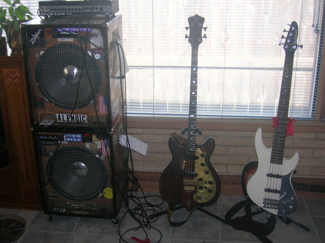 the Bass on the right is a very funky fender-jazz Bass sounding De-armond 5 string with a 3 band EQ I found new for $250,00 a few yrs ago!