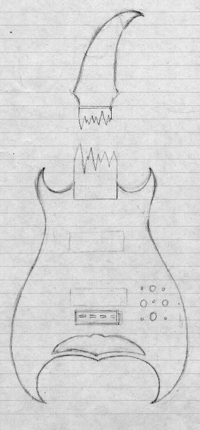 don't worry, i've been a good student this time thoughand drew this at about 10pm instead of when i was meant to be working. Came up with another one, think i actually prefer this one actually. I've tried to make it a little less crazy and slightly more realistic, with what to me seems like a rediculously wide omega heart at the bottom, although now looking at it i think the curve on the right should go in deeper... And chuck, I did consider a headstock as you can see, although i think the proportions of it would need changing.
