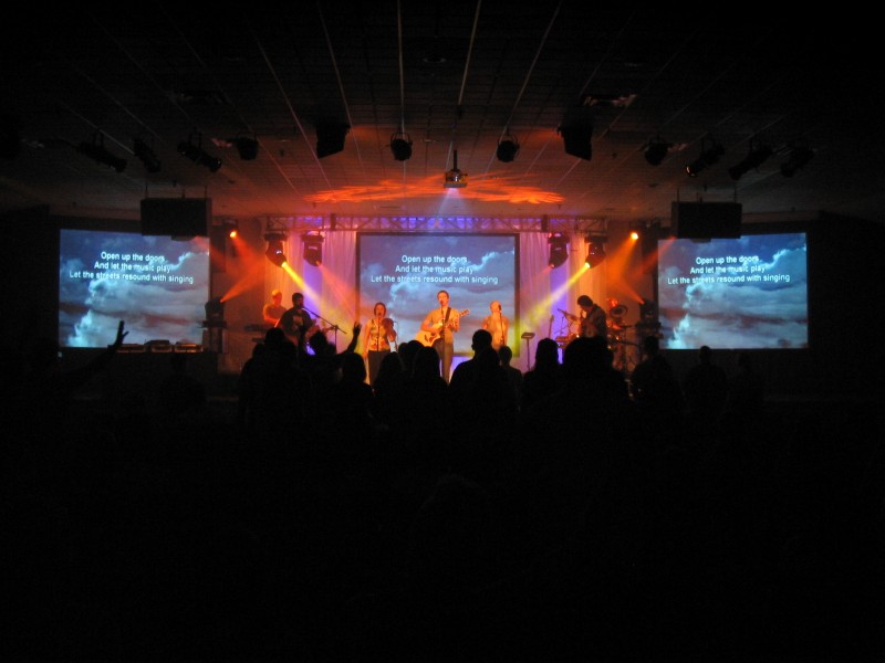 Doc, cool pic. Slightly differnet set up for us, the band pretty much stays on the back line and the vocal team has the stage - we're still wired up and I'm not sure music stands would look any better with lights. Our worship leader is pretty animated and a fantastic vocalist. He's not part of our rehearsals, so it's pretty lively on Friday nights - where's he going now?