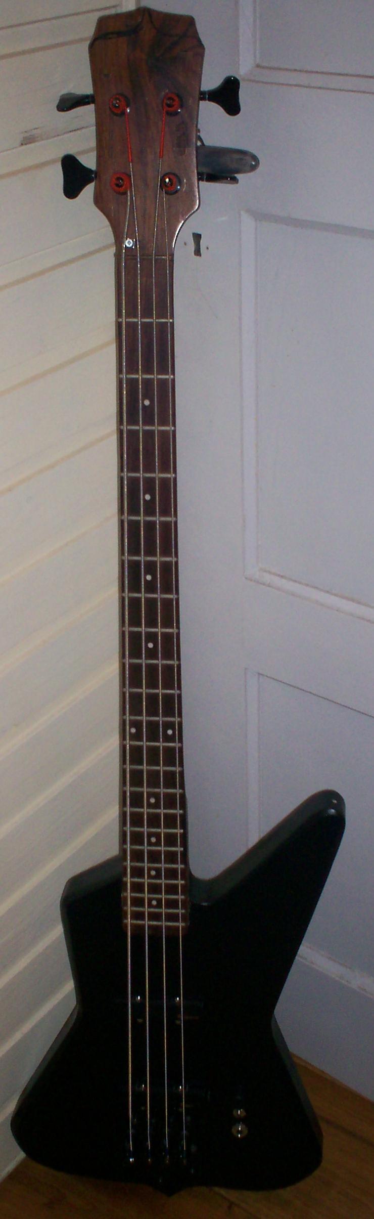 The shape looks wonky but with it's strap button at the backside of the lower horn it balances nicely and the shape also allows me to carry it around in a normal gigbag. The pickups are from Magnetics, the bridge from kahler, it has a pine body with a mahogany neck with a rosewood fingerboard. It sounds very much like a Jazz bass really but the active magnetics pickups give a real punch and piano-like clarity. I can do a very convincing Stanley on this.