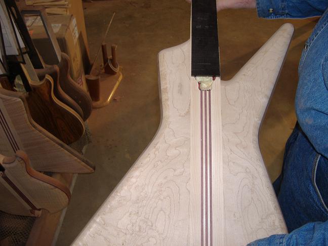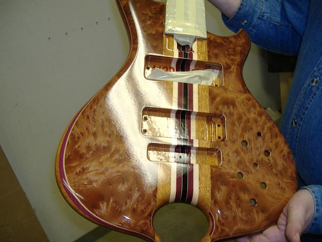 Wow, those first two are awesome.  The pinstripes around the center laminates are awesome, and it's interesting how similar they are, yet different to the the reversal of the Ebony and Purpleheart.  Coincidence?  Or is some bad boy getting TWO awesome beasts made at once?  It boggles the mind to think about.  They sure look awesome.