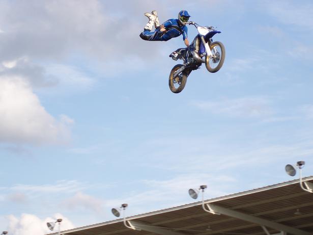 cool, we saw a perfoming troup like this at last year's Super Bikes races. Was pretty cool until one of the riders  over shot the landing ramp landed flat and burried his shoulder and bike into the parking lot.  Yeeowza.