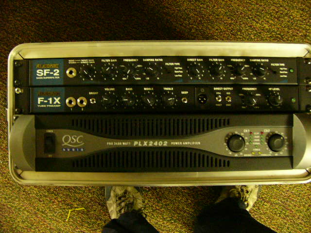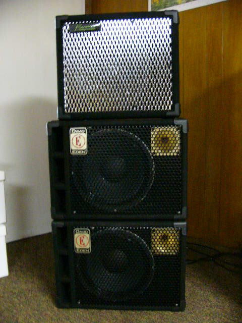 I haven't felt the need to use all 4 yet. I'm running them full range in parallel mono, with the Eden(s) on 1 side and the Berg on the other. The light weight of the cabinets is great, and the fact that I can use only as many as I need is cool, too. Since this is turning into a photo esay on my rig, here's the front of the rack...