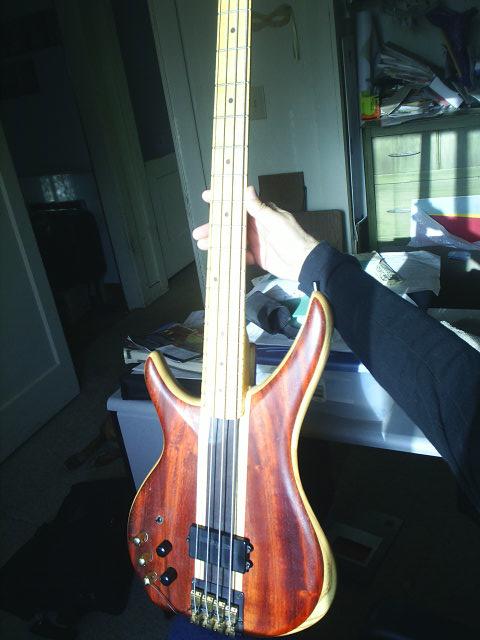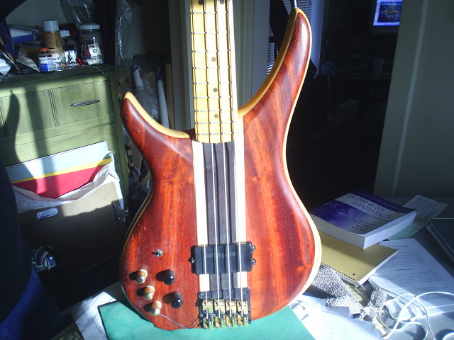 I always wear a respirator even while I'm sanding. After a few minutes without one my nose starts running. Allergies, I hate them! Oddly enough I have done some sanding of cocobolo in the past unprotected and not experienced any noticable affects other than the aforementioned nose discomfort. Just lucky I guess. Thanks for the advice. It sounds like a big job, something i'm not quite ready to tackle. There are some new water based finishes that come highly recommended from LMI (Luthiers Merchantile Inc.)that are actually brushable, self leveling and compare favorably to nitro for looks so I may go that route for now By the way, I don't plan on changing the finish on this bass. I like the look of the oil /poly finish as it is . My interest is for a future project, one that I started many years ago,(81') I believe. It has sat around in pieces all this time and I have finally decided to finish it. They say imitation is the sincerest form of flattery. I hope you'll agree. ;)