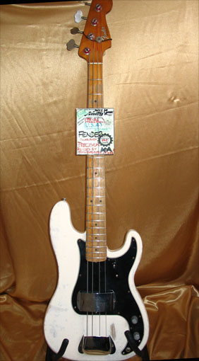 The bass was a white, with blue-ish veins appearing through the paint layers, and the body had 90 degree edges. I thought, That must be a Slab P-Bass!! It turns out I was right - and it's for sale too.