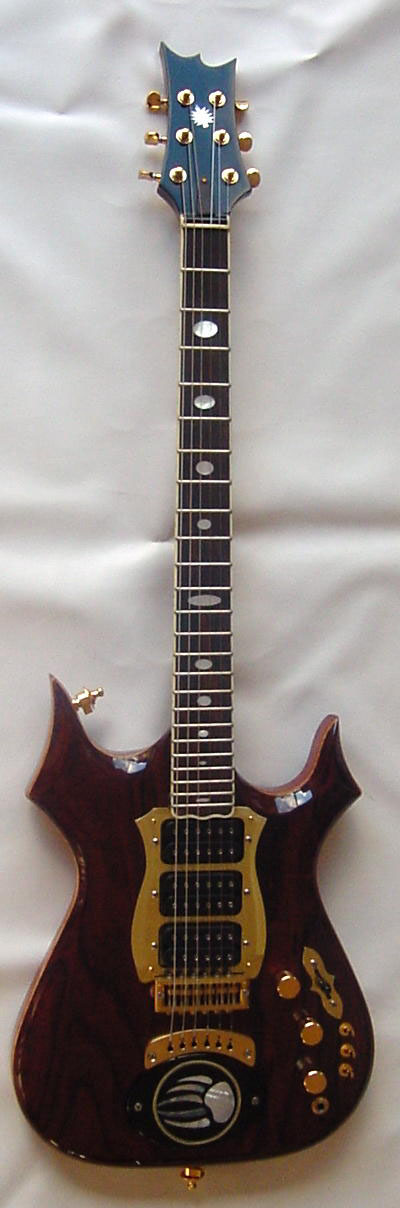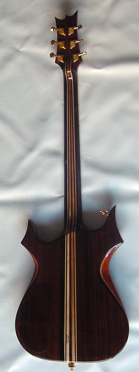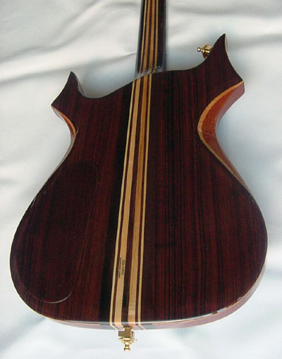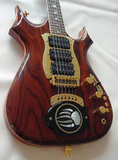 Next to my custom Alembic, this is the most incredible guitar I've ever played. Tim and Pat O'Donnell, who continue Stephen Cripe's legacy, do some fantastic work. Here are a couple pictures of my own Tiger and Alembic inspired Resurrection Lightning Bolt. It's much heavier than Bear, weighing in at around 10 pounds. The top is a variety of rosewood, very similar in color to morado. The body is a five layer sandwich of rosewood, maple and mahogony and the neck is a nine piece sandwich of the same. The fretboard is the very same opium bed rosewood that the top and back of Jerry's Lightning Bolt were constructed of. They still had a few pieces leftover.  Regards,  Jonathan