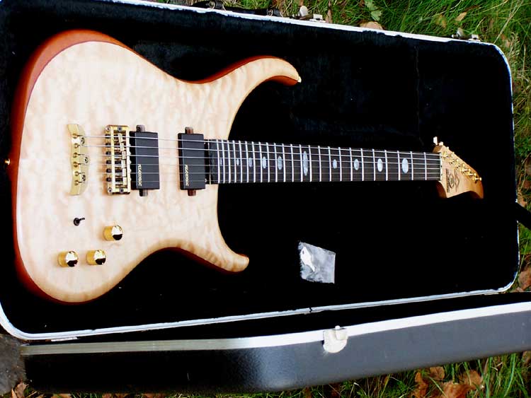 I have been looking for an alembic guitar for quite a while now and have lost a number of auctions on ebay. Thankfully I have agreed a buy now price for an Orion Guitar that was on sale on ebay from a German Music store rather than risk losing this in a battle at the end of the auction.  The guitar has a quilted maple top, maple neck , ebony fretboard, mahogany body with purpleheart pinstripe, gold tuners, bronze logo, 25.75 scale length, brass hardware, gold strap pins, plastic oval inlays completed 10/03/95, serial No:?9509260USA  Hopefully I will get my grubby little fingers on it it during the next week. Here are some photo's of it from the Ebay listing.  Full frontal