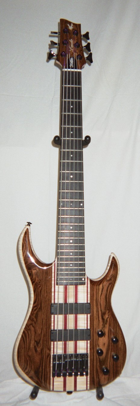 Bocate top, Purpleheart back, Flame Maple body and neck with Purpleheart laminates, Ebony fingerboard.  Bartolini pickups, controls: Vol, Pan, Bass, Mid, Treble.