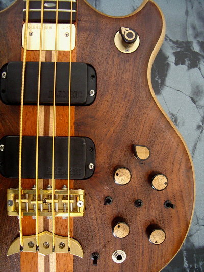 Future plans are to get side LED's and a treble boost/cut switch. As you can see, I've already altered the electronics. The solid teardrop knob is a master volume knob. Switches (left to right) are bridge Q, Neck Q, Bass cut/boost