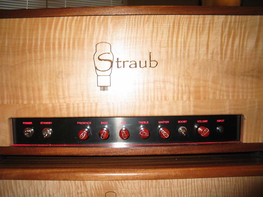 The knobs are from Roger at THG. It's hard to tell from the pics, but they are cocobolo inlayed with the Straub logo as on the faceplates of the amp and cab (i.e., tube with a S inside) in Mother Of Pearl.