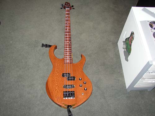And here it is complete!    The neck I purchased from Warmoth. It is padouk/pau ferro with stainless frets. The tuners and bridge are Gotoh and the pickups are Seymour-Duncan quarter pounders. I drew the body free hand a few times before I came up with this look. I wanted something radical yet classy, but ended up with this as my drawing skills are not as good as I had hoped! This piece of wood was laminated together over 15 years ago, from what I'm told. It sat in the corner of the shop since then, just collecting dust and being ignored. I left the biscuits and glue joints exposed to give it that rustic "I was left for the scrap heap until someone saw something special in me" look.    Now if you'll excuse me, I have to go set up the intonation and hear how it sounds!!!      Paul TGO