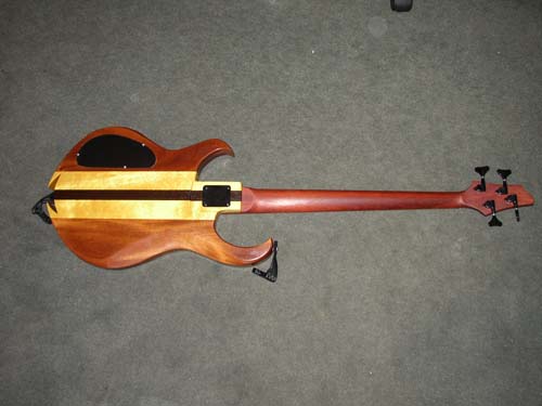 Here is the body after all carving, sanding and machining with the polyurethane applied. The only tools I used to make the body were a router, scroll saw, spoke shave, files and sandpaper. And of course, the drill for a few holes