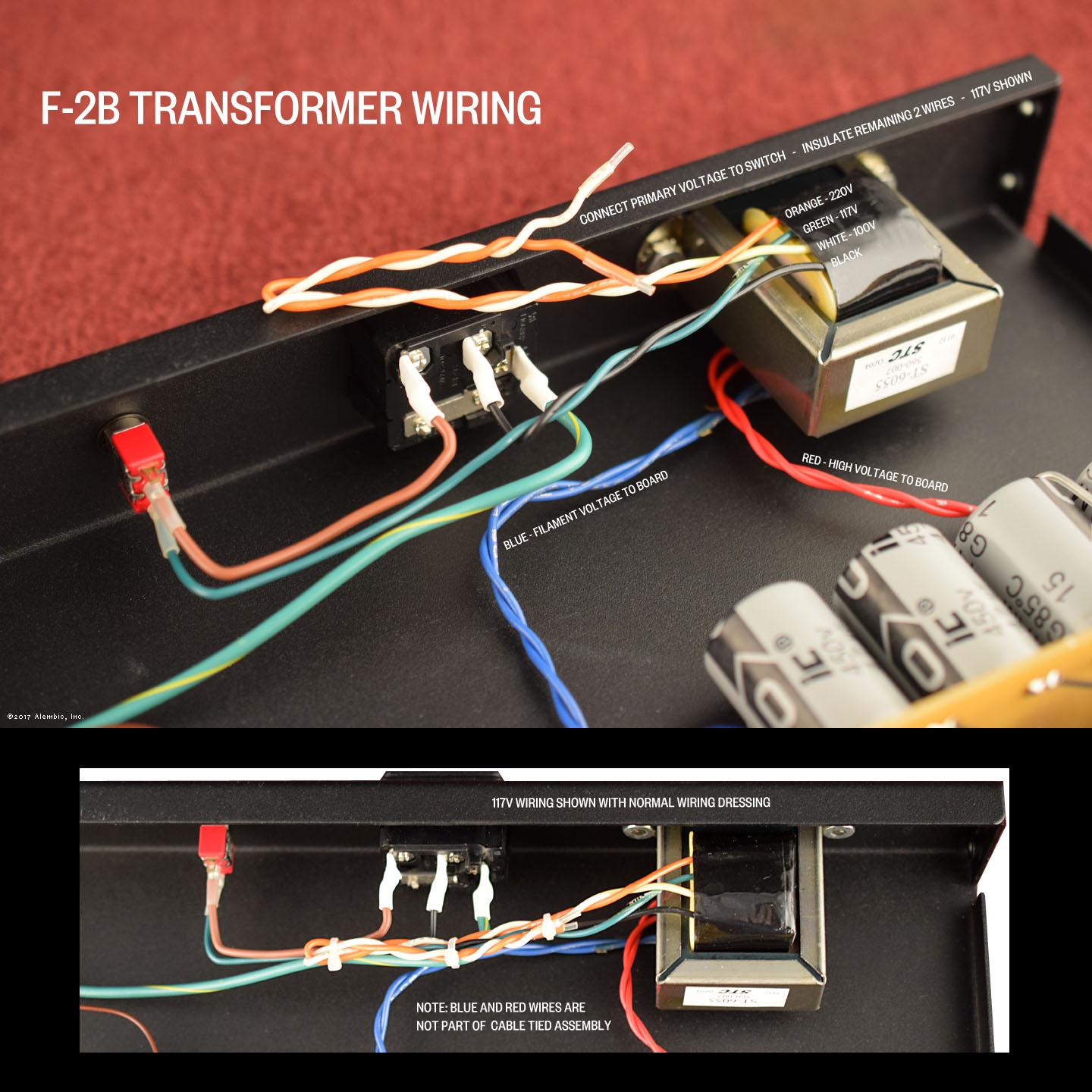 For a transformer transplant on a old single voltage F-2B, you had 2 black primary wires.  Now your new "black" wire will connect to the fuse.