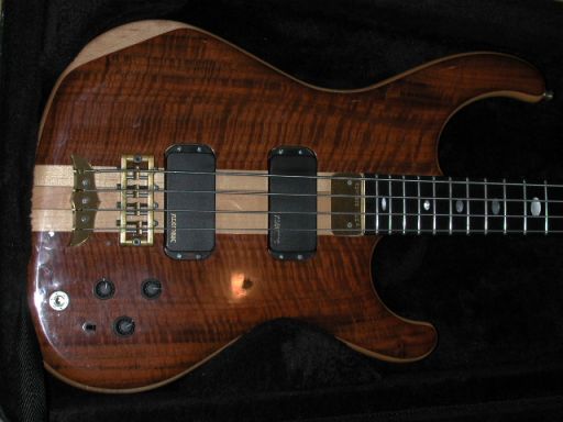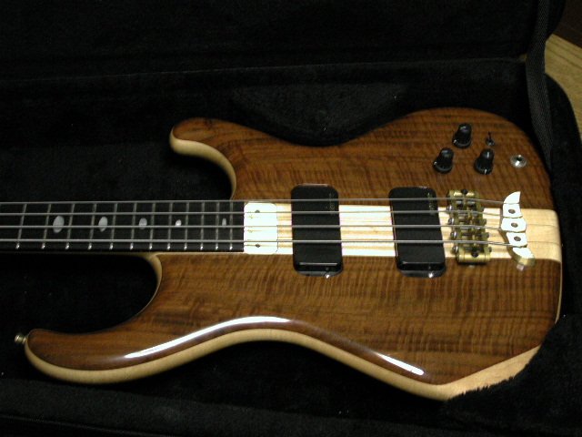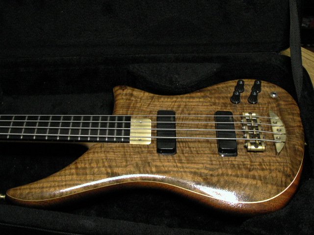 The bass pictured is the Flame Walnut. The flame figure is like what you see in Flame Maple - a cat's-eye like appearance usually about 90 degrees from the dominant grain pattern, like what lots of people call tiger flame maple.