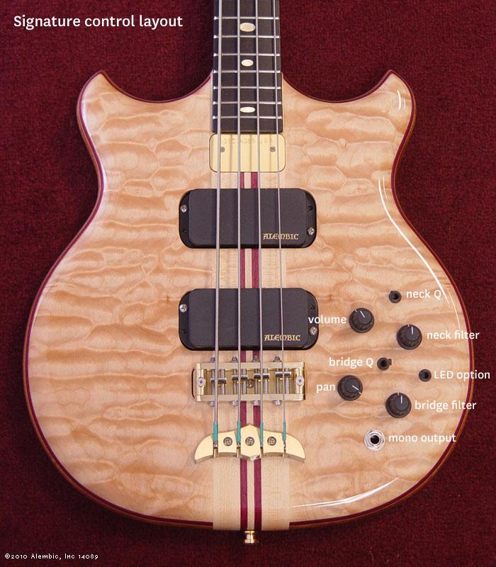 Signature controls are volume, balance, neck pickup filter, neck Q switch, bridge pickup filter, and bridge Q switch.