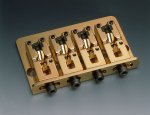 Nice bass!!! Alas "Broomstick" is a Korean Squier so about 4 leagues lower than the Japanese ones. Neck is great however but sound sucks. Well ...chnagements will have to wait still some more years. Hartmut: for your bridge: I know Schaller has some high end, "gold" plated bridges (those with the "wheel" string guiders I add a picture of the black one). I know Fender used these bridges on their Fender Precision "light" models. Schallers must be easy to find in Germany I guess. Also the golden tuning heads are easy to get from Schaller but ...that you knew already I guess. There is also such a thing as the Schaller 2000 bridge also possible in "gold" (see picture). I know some brothers who changed their bridge to ABM. The Schaller 2000 and the ABM have the "Alembic" stringball-hook-up system for fast string changing. The Schaller "wheel" bridge -although VERY precise- has a pull-string-through-system, like the Badass.  Paul TBO