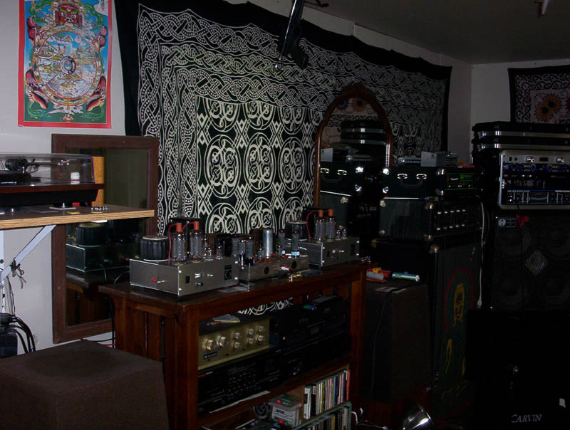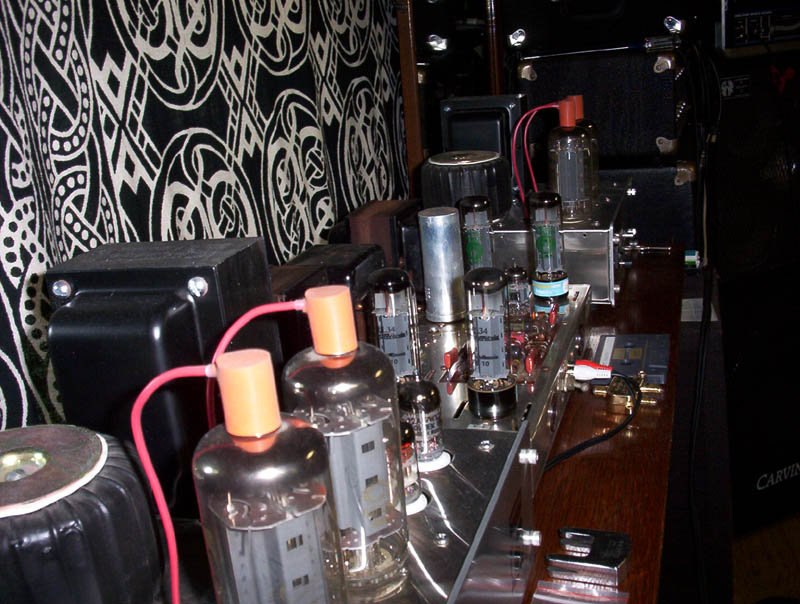 The amps are huge (6 chassis), mainly because the powersupply uses oversized transformers, tube rectification (6CJ3), DC heaters, choke input and polypropylene caps. The top chassis for each channel is a simple Jarrah wood box with a brass plate top and 2 813's and 2 6H30's on it. The 813's throw enough light that you can easily read by them, and enough heat that I prefer not to use them in summer.