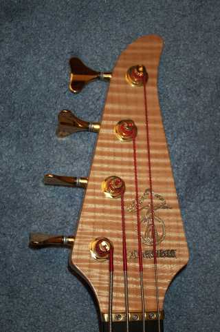 Hello... my '95 Custom short scale arrived safe and sound. I did a complete set-up for my playing style including relief, pick-up height, action and new GHS Boomers(.045-.105). I took her to rehearsal on Thursday and man...this child can thump! Cut through the band like a stiletto! I compared her to my '01 Essence short scale using the same amp, EQ, etc., and she seems to have a bit more presence. The neck is wider than my Essence but I kind of like the variety. Here are some pix of my "two" Alembics (man, it feels good to say "two Alembics"!). Frank