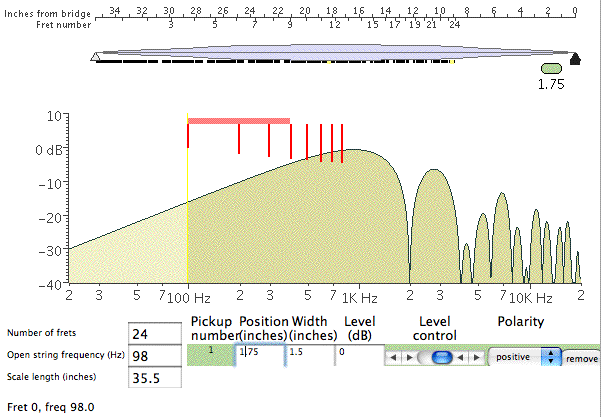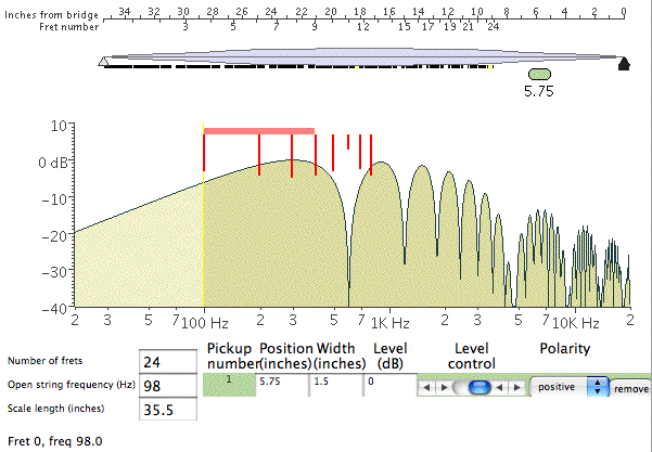 talks about an experiment in building his own cabinets, that resulted in removing the horns he had already purchased because he found nothing useful coming out of them. -------- Moving right along...:-) Tillman's demo applet is indeed quite interesting. I downloaded the code and made some small enhancements for my own purposes a couple years back, and learned some interesting stuff. So I'd like to emphasize a couple of points to help prevent misinterpretation of the graphs. First of all, the chart does *not* show you the response that you are actually getting from the pickup(s). If you don't think about that, and just look at it, you might find yourself saying, Wow, look at all that stuff going on way up at 10 kHz! If you doubt this, try "playing" different notes on the fingerboard at the top, without changing anything else, and you'll see that the plot doesn't change in the slightest. Also note his disclaimer, that it "does not show the effects of the pickup's electrical parameters (inductance, capacitance, loading, etc.)", so it does not reflect the fact that above pickup resonsance - say in the range of 3-6k - the pickup will be rolling off the response quite a bit more. If you're interested, we can look at a few examples. Aside from general curiosity, I spent some time with this program trying to help me figure out whether I might prefer FatBoys to MXYs, or whether I might prefer a different location for the neck pickup. For starters, here's a way to get a more visual or intuitive grasp of this comb filtering business (I haven't needed a comb in so many decades that this is a difficult concept for me...). Here's the plot you get for my bass with a FatBoy in the neck position only (not using the bridge). The numbers are a bit approximate, but my pickups are in the standard position Alembic uses for a 35" scale Rogue; I used a width or aperture of 1.5" for a FatBoy (or Series) and .75" for an AXY/MXY: