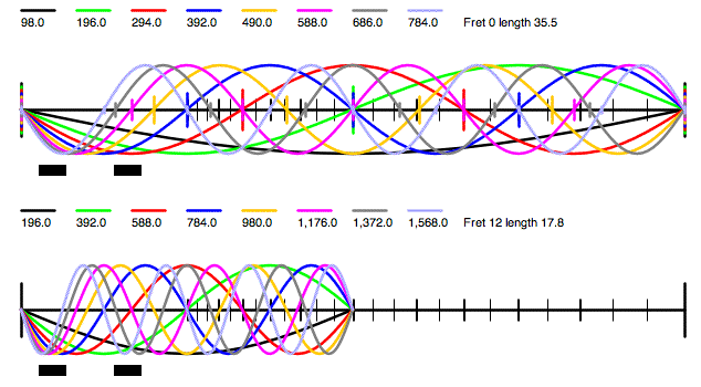 The plot on the top shows the first eight partials of the open G string. Note how the 6th (pink) at 588 Hz has a node or null point nearly centered over the neck pickup. That means the pickup can't really "see" this frequency, hence the first notch around 600 Hz. The bottom plot, fretted at the 12th, shows the same first notch (now red), and a second one (pink) around 1200 Hz, also visible in Tillman's graph. By the way, this is essentially just what the program does. It loops through the range of frequencies, figures out what the shape of the wave is above the pickup, and sums the amplitude at each point over the pickup. So if the wave is either fully above or below the axis then you get a large value, while if it crosses the axis within the pickup width you get some cancellation, equating to zero if the crossing point is dead center. Though I may have missed it (don't think so), he makes no attempt to adjust for decreasing amplitude in higher partials, partly because he isn't working with partials per se, but also based on his statement in a referenced article that magnetic coils are more responsive to higher frequencies than larger amplitudes, "so it all evens out" (not a direct quote, but close). While I think that might be fine as a first approximation, my guess is that it significantly overstates the response above around 1-2 kHz. What I believe you see in these charts assumes that even up at 10 or 20 kHz, the string is vibrating in a way that *could* produce as much output from the pickup as the open fundamental. Though it's useful to look at it this way within the range of notes you can actually play, it becomes unrealistic at the higher frequencies. Back to the charts with all the sine waves, note how much less confused things are down at the bridge pickup, which is evident in the Tillman plot for just a bridge FatBoy - the first notch is all the way up around 2 kHz, because that's the frequency at which you first get a null/node over the bridge pickup: