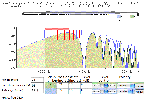 Notice how the narrow aperture at the neck helps a lot to fill in the gaps, and is consistent with my preference for this combination. If I ever built another custom, I would probably move the neck pickup closer to the bridge to further even out the response (you can always add more bass with a SuperFilter). ----------- Finally, one more question/comment for Nic. In regard to the 9 dB Q switch gain, you state that "The goal is to recover the raw string information that disappears into the first few notches in the comb filter". Well, maybe, but I'm quite skeptical about both the implied motivation on Ron's part, as well as the effectiveness. The main problem I have with this theory is that the notches are significantly different for each of the pickups, and furthermore for each of the strings (on each pickup). Here are the approximate positions of the first notch, for strings EADG, separately for each pickup, and combined with both pickups (both assumed to be wide aperture in standard positions): neck: 250, 330, 450, 590 bridge: 830, 1100, 1470, 2000 both: 370, 500, 650, 850 With two pickups, even the 8th partial doesn't get up to the second notch until you're playing above the 13th fret or so. For just the bridge pickup, the 8th partial won't fall into a notch for any note you can play, although for neck only the 8th falls into a hole when you play at the 7th fret, and you find the 3rd notch if playing the 14th fret. So where am I going with this? - Let's assume for the moment that the tone you actually end up hearing, is shaped almost entirely by the first 8 or fewer partials. I think this is actually somewhat generous, though no doubt some will disagree, and I'm interested in "hearing" any serious counterpoint. - If that's a valid assumption, then if you are using an even balance of both pickups, the second notch doesn't affect you until you are playing above the 12th fret. - The notch you have to contend with ranges from around 370 to 850 Hz, depending on which of the four strings you happen to be playing. Now, you might *conceivably* try to use Q to fill in such a notch, but would encounter at least the following problems: - you could only do so for a single string - you would have a very difficult time dialing it in that precisely - setting the filter frequency low enough to cover any one of these four points would have already grossly colored your sound, not helped to even it out. Look, I'm not trying to be difficult or obnoxious, but we are talking about physics and lots of numbers here, and I think it's important to review carefully. While the magic of the 9 dB number seems to work out conveniently with some of the math, I don't buy the suggestion that it is there to deal with the notches in the response curves, or more generally to help even out the pickup response - which would imply you should leave it on all the time, at some particular frequency, to get the most even response, except that it won't do so as noted above. My personal guess is that the value was chosen largely because it provides for an interesting variety of *uneven* responses, depending on where the frequency is set. It makes for an interesting tone shaping device, not a solution for the uneven response due to comb filtering. But hey, I've been wrong before, so please feel free to straighten me out. -Bob