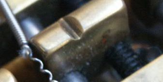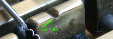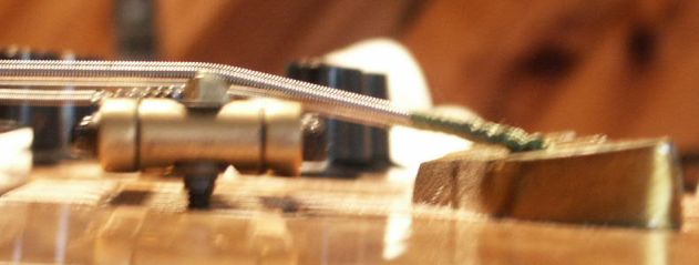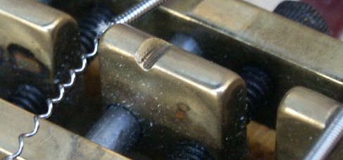 If that _is_ the break point, it's a little tricky to fix. If you file that point of the groove to round-over the lip, you move the apex of the saddle backwards somewhat. Then you start to introduce saddle rattle possibilities. A _very_ fine needle file should be able to round that front edge over; the idea is to change the groove contour to allow the string to contact the saddle along the entire bottom 1/2 of its diameter, while moving the apex point from the exact edge back no more than about 1 winding width.