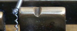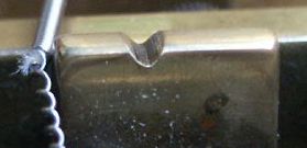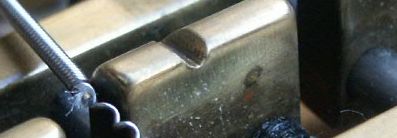 I think the main cutting edge pressure point is about 1/4 string diameter up on the front edge of the notch, just about exactly where mica's arrow is. In her picture, you can see about three string windings embossed in the saddle on that side, and a pretty clean fulcrum point at the face.