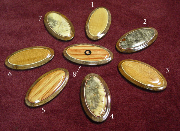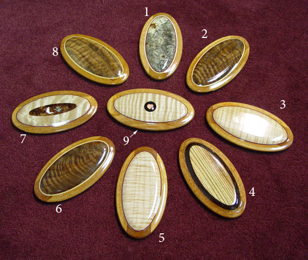 Mahogany boxes with: M1 - Buckeye Burl M2 - Flame Walnut M3 - Flame Maple M4 - Zebrawood M5 - Flame Maple M6 - Flame Walnut M7 - Quilted Maple/Burl Rosewood/Salamanders in Abalone M8 - Flame Walnut M9 - Flame Maple/Ebony disk, Pink Ivory Heart, Abalone tear