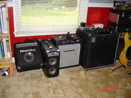 I use the following:  Main Rig:  An F1-X, an SF-2, a Korg DTR 1000 tuner, a Furman AR-1215 voltage regulator, and a QSC MX-1500a to power it all (I'm looking into getting a PLX series ... the MX is heavier than a ton of bricks!).  The cabinets are Ampeg BXT series, once used by Victor Wooten at a Blues Alley gig in the DC area.  Practice Amps: I have an Ampeg BA-115, a small Rocktron I bought in Korea, a Hartke A25 (also from Korea ... 220V), and a recently purchase Phil Jones Bass Briefcase - love that thing.  Portable as hell, and great tone.  It will even run on a car or internal battery.  I went to Myrtle Beach this past weekend, and took my Lakland 4-94 and the Briefcase.  Worked great, and took up very little space.  I also have an Ampeg BA-210SP that I use in Korea when I'm there - it's at a friend's apartment.  Finally, I have my Ampeg SVT-IV Pro that's now sitting in a rack case since I got the F1-X and the QSC.  It's a great self contained amp for what it is, and powerful.  It was my main amp for the last three years.  Keith played through it when he visited - I had the SF-2 hooked up to it, and it made it incredible.  Alan