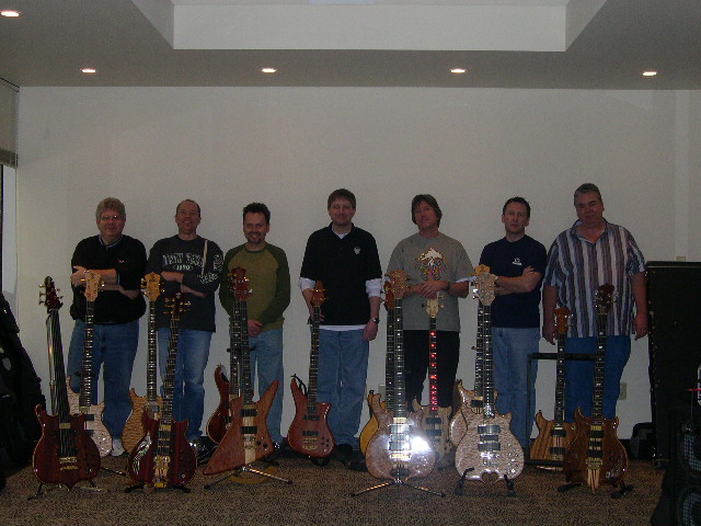 Front row, from left to right: Series II 5 string fretless; Series II 5 string - ?Flight of Fancy? (Dec 2002 COTM); Exploiter 4 string; MK/Europa hybrid 5 string; Series II 5 string - the ?Unicorn? (June 2002 COTM); Series II 5 string.