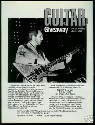 There is an ebay ad up for what looks like a page cutout from an old issue of Guitar magazine. The magazine text at the bottom of the page describes John as being pictured above with his Alembic spoiler bass.