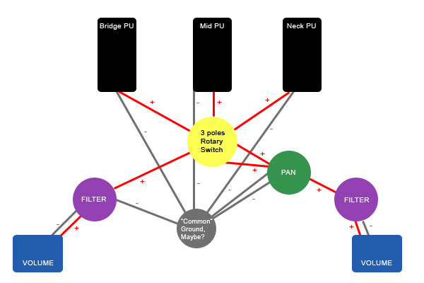 In case you need to know, the wiring is like so; 3 PUs + 2 Filters + 2 Q-switches + 2 Volumes + 1 Pan, in this scenario 2 PUs are sharing 1 Filter + Q-switch (all this was done and worked fine) With a the newly added rotary switch, I'll be choosing which PU pair is sharing the Filter + Q-switch, as simple it sound.