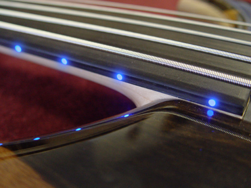 Like our other side LEDs, these are inlaid in tiny sterling silver circles. We've added a diffuser so the color and brightness is even up the neck.