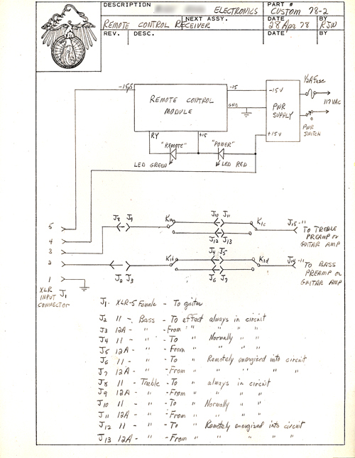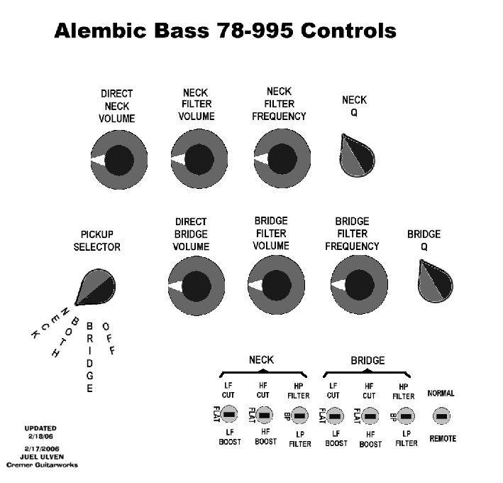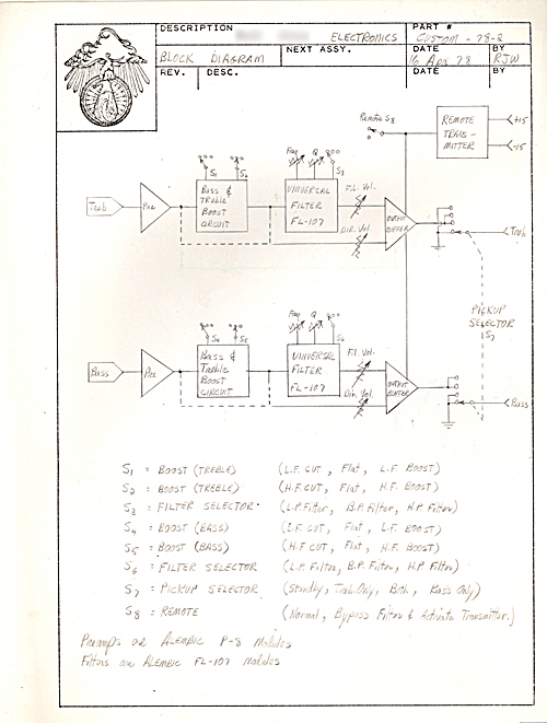 The first picture shows that each pickup has it's own superfilter with a filter volume, frequency filter, CVQ, and a switch to set the filter as low-pass, band-pass, or high-pass. Each pickup also has a direct volume that by-passes the filter. And each pickup also has a bass boost/flat/cut switch and a treble boost/flat/cut switch. There's also a pickup selector switch. The last switch apparently switches on a remote control transmitter; which must be the stuff that's in the top control cavity. I'm guessing it has something to do with the effects loops in the power supply.