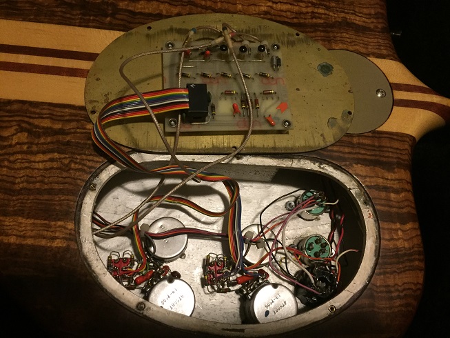 Thanks again for the feedback and info, much appreciated.  Jimmy, yes there was once a synth pickup in this bass.  This is 75-174, there were two previous owners (Andy West who used the synth and a person after him who removed it).  The synth pickup has since been removed and the 4-pin disabled.  Pictures of bass body and electronics cavity below.  Although it plays and sounds great right now (aside from a little background noise) I will look into scheduling a time to send it in and have it restored to current specs.  Thanks,  Rob