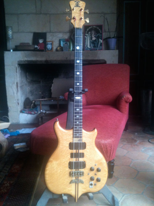 Fast-forward 15 years. After I'd moved to Nashville, over time I got 'round to all the music stores here. Gruhn's was an eye-opener after having read about them for so long. I walked into one of the 'too-cool-for-school' shop at that time, Rock Block, full of graphics-painted Jacksons, Steinbergers, the then fairly new Taylors, and so on. I look up in the midst of all the axes hanging six-high up the walls, and . . . . there a five-string Alembic, Series-shaped, in see-thru red. The room began to spin . . .