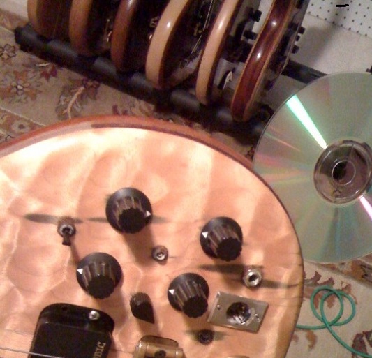 As you can see the bass is very delaminated to the point of where I can insert that CD in several places.  The finish is a mess and missing here and there.  You can see the black staining in the 5A quilted maple from the switches and pots rusting from the salt water.  All of the toggle switches are either rusted away or broken.  The neck pickup volume control will not move.  I even tried to spin it using a vice grip.  No luck.