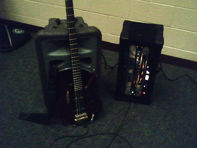Here is a pic of my little rig.  It really filled the auditorium though.  I LOVED doing low note volume swells becuase of all the natural room reverb.