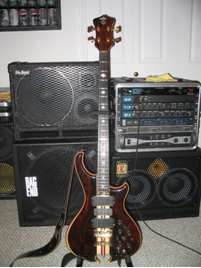 I received my bass last Friday (the 13th - just to show you nothing is all bad!).  It is wonderful.  My wife got home with the digicam this evening and these are the first few shots I took.  Some are a bit overexposed (making the red highlights look slightly more orange than in person), but I couldn't resist posting them.  I also included pix of my current rig, since it's all been aquired within the past 6-8 months (still a work in progress).  Well, here goes...