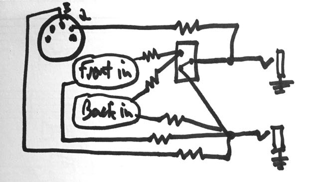 With the switch in the lower position (as drawn) the rig runs in mono with all signals summing out of the bass/mono output (top right jack - sorry forgot to label it) with only one resistor in line with each source... Actually, now that I look at it, both output jacks would have the same mono signal...