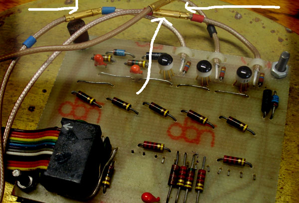 If the knob and switch exercising doesn't sort things out, the next test is to swap the pickup inputs to the board - as seen above.  Make it red to blue, and blue to red.  This can tell you if it's a pickup problem (not likely) or a preamp issue (possible, but also rare).