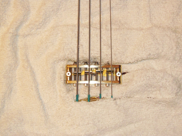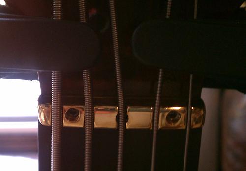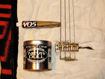 Remember we're talking about polishing ONLY the unfinished parts here . . . so do NOT try and use a brass polish on clear-finish or plated parts (anything with a chrome or gold-plate or black finish). So generally we're talking about the bridge and adjustable nut on most, but not all, Alembics. If all of your hardware is gold or chrome or black plated, do NOT do this, as it can scuff the plated bits just like sandpapaer.
