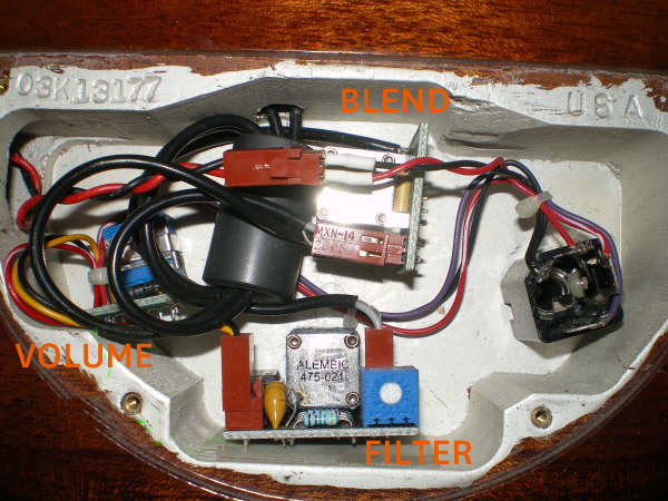 I've labeled the controls for their function. The pickups should each plug into the blend control board. Then the filter control receives a connection from the blend control and the volume harness.